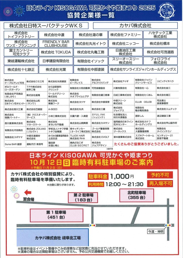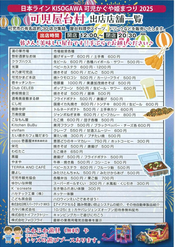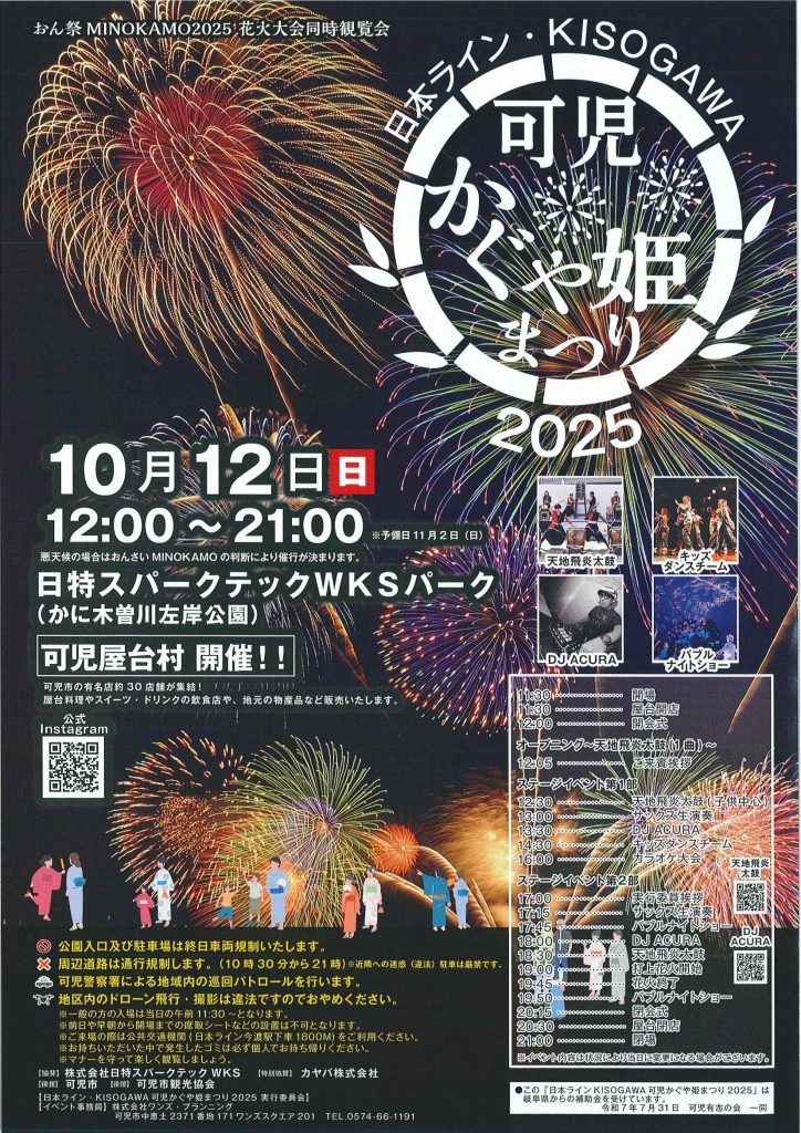 可児かぐや姫まつり(後援 可児市観光協会)について開催日時:10月12日(日) 開催時間:12:00~21:00 主 催:可児かぐや姫まつり2025実行委員会(可児有志の会) イベント事務局:㈱ワンズ・プランニング 0574-66-1191 ≪イベント≫ ステージイベント第1部 12時~16時 ステージイベント第2部 17時~21時(19時~打上花火開始) ≪可児屋台村≫ 屋台料理やスイーツ、ドリンクなどが販売します。 可児市観光協会は、栗ご飯などを販売します。 悪天候の場合は、おんさいMINOKAMOの判断により催行が決まります。 ※予備日11月2日(日)